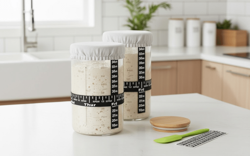 - Ergänzende Hilfsmittel: Extras wie ein Teighobel oder ein Schneebesen können nützlich sein, um den Sauerteigansatz zu vermischen und die Sauerteiggärung zu überwachen. Sie machen den Prozess angenehmer und effizienter.